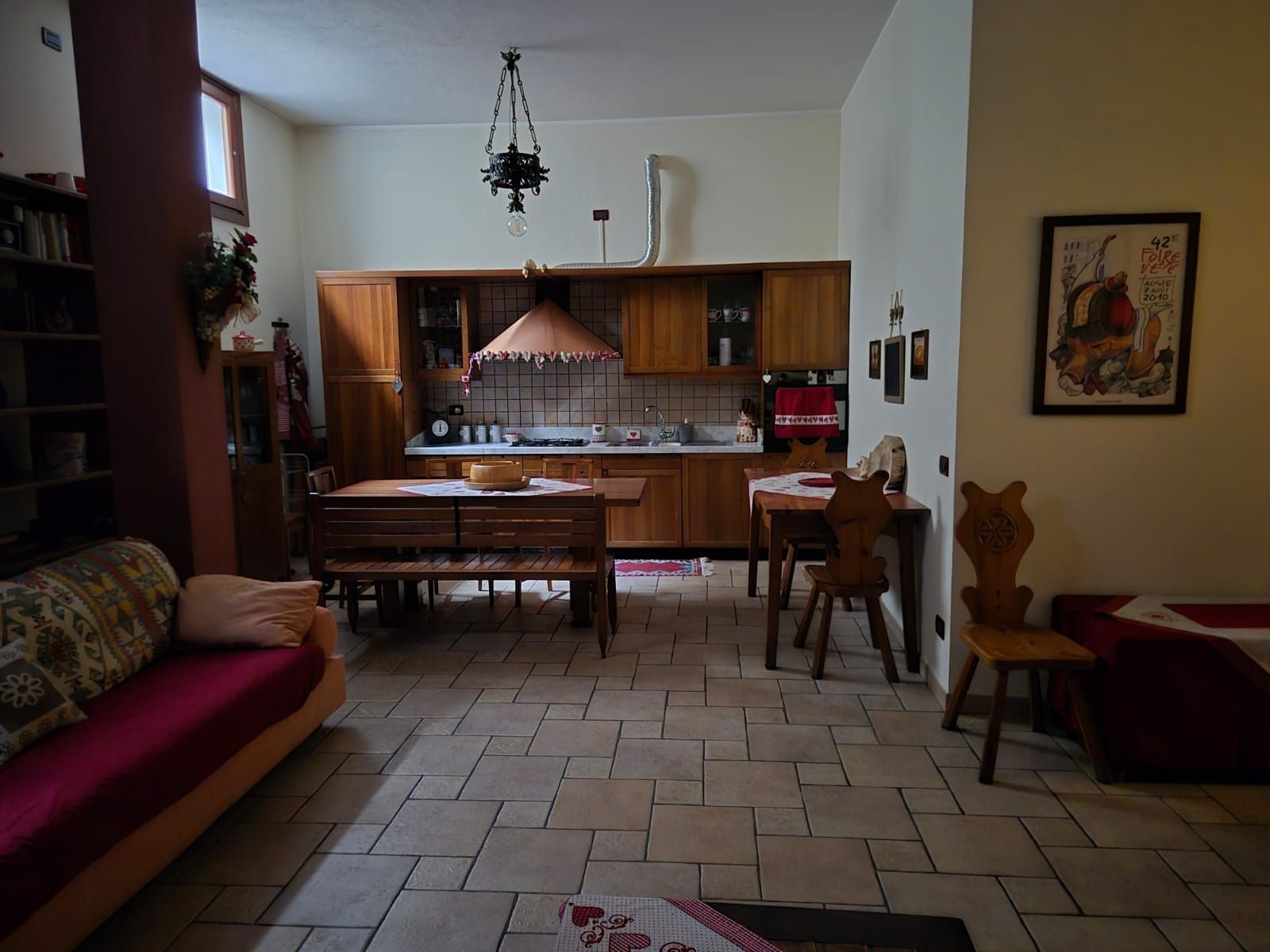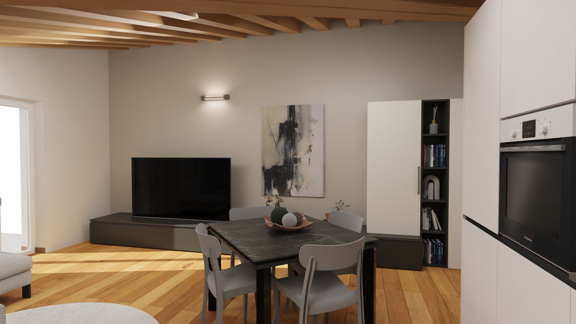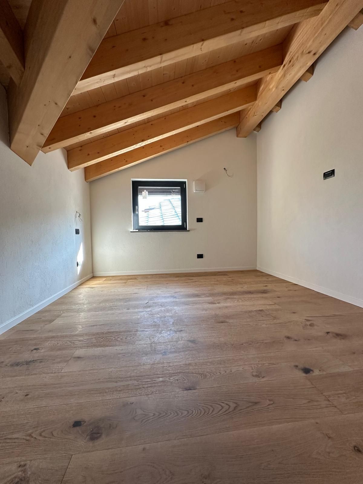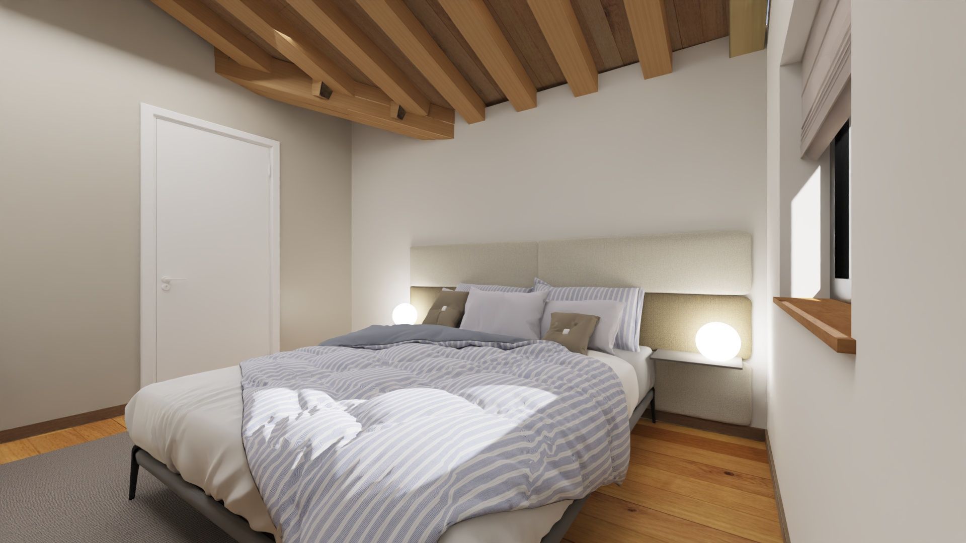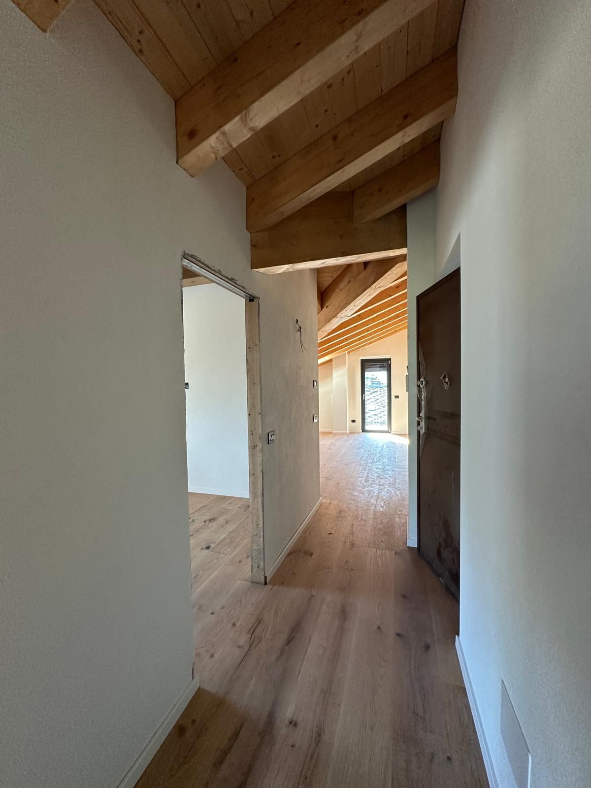L'appartamento bilocale si trova al piano secondo,è un piccolo Loft mansardato dal desinger caldo e accogliente, i rivestimenti in legno di abete lamellare del tetto creano un'atmosfera tipica delle case di montagna e i terrazzi, oltre alla luminosità, conferiscono uno spettacolo paesaggistico unico.