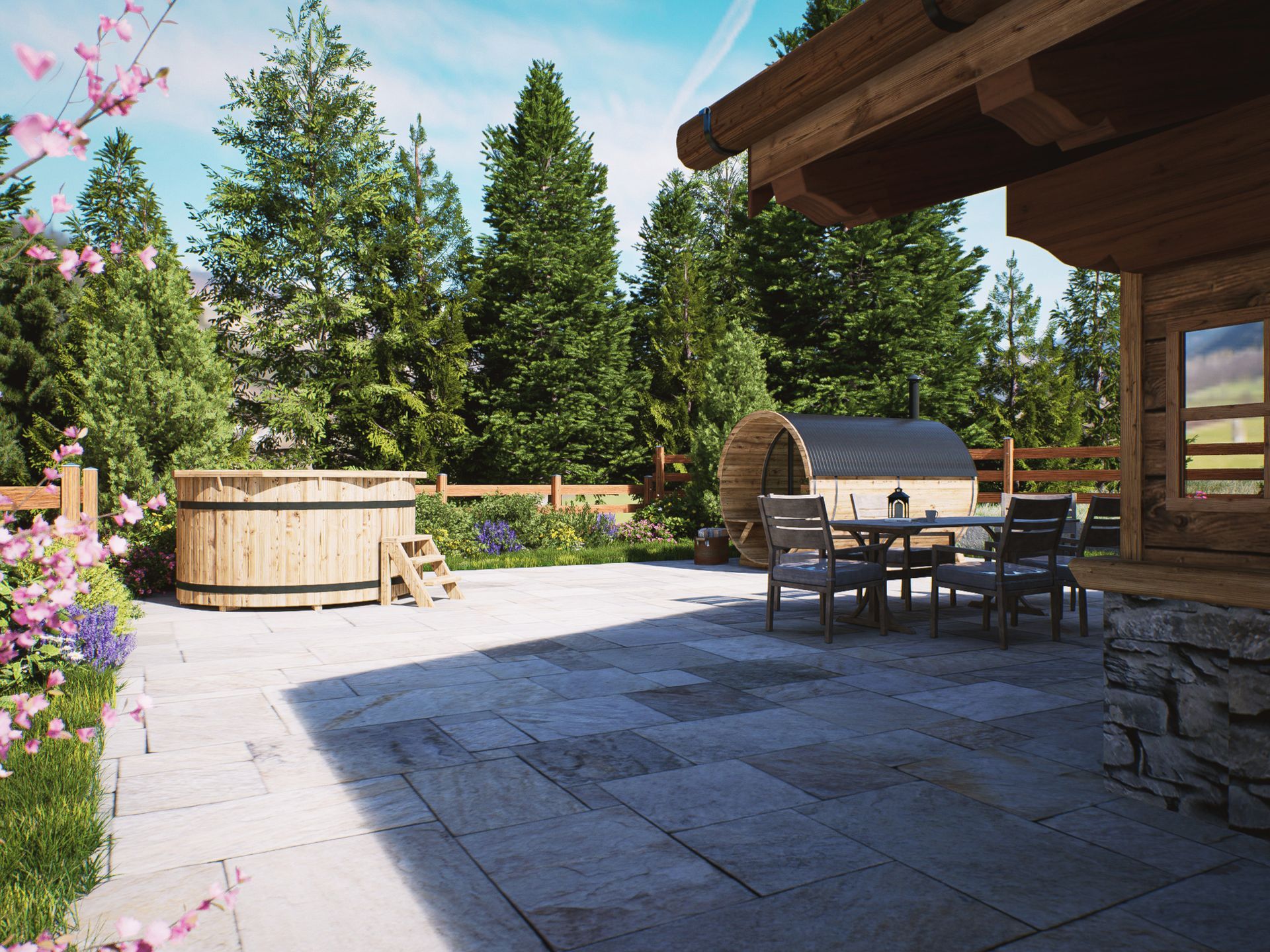 esterni in pietra e legno antico, pensato e realizzato dai nostri esperti per offrire il massimo del confort e del piacere di godere al meglio dei momenti di relax.